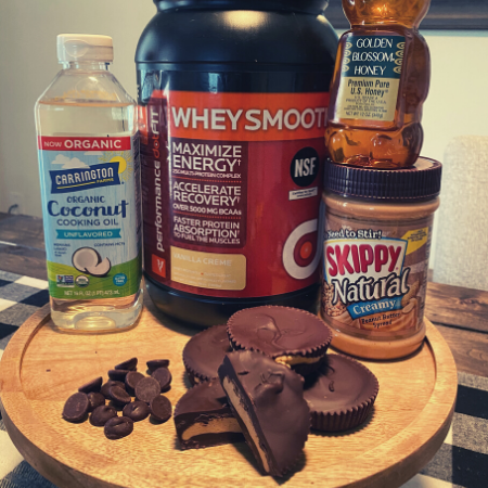 5. Place 2 tsp of PB/protein mixture into melted chocolate in muffin lined well.